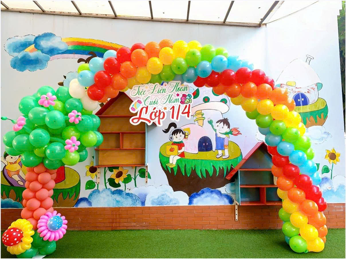 Vòm cầu vồng đa sắc: Sử dụng kỹ thuật kết bóng xoắn truyền thống với đầy đủ các gam màu rực rỡ: Đỏ, Cam, Vàng, Xanh lá, Xanh dương... tạo hiệu ứng dải cầu vồng cong vút ấn tượng.