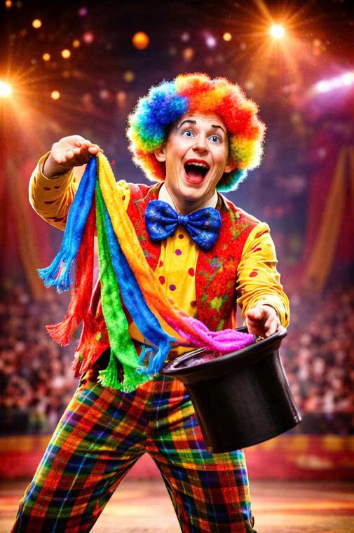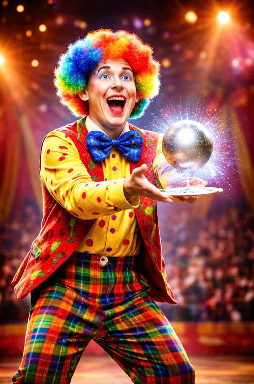 Chú hề ảo thuật là nghệ sĩ biểu diễn vừa mang ngoại hình vui nhộn (trang phục sặc sỡ, mũi đỏ, tóc giả), vừa sở hữu kỹ năng ảo thuật khéo léo để tạo ra những màn trình diễn bất ngờ, hài hước và tương tác cao với khán giả.