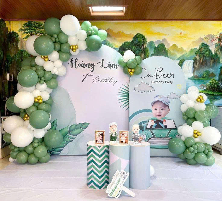 TRANG TRÍ BACKDROP BÉ TRAI TONE TRẮNG -XANH LÁ