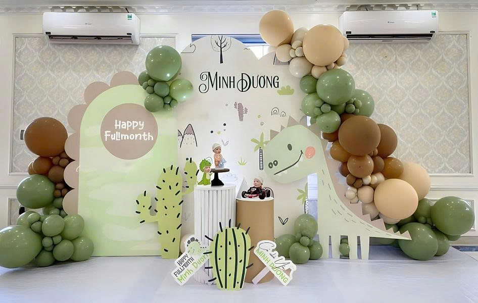 TRANG TRÍ BACKDROP BÉ TRAI TONE XANH TRẮNG KHỦNG LONG