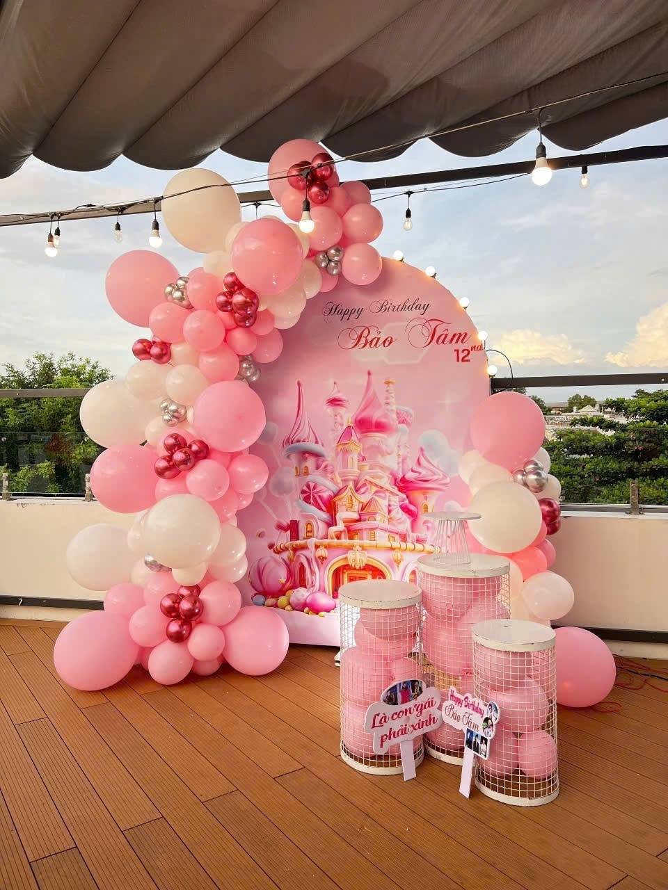 Xứ Sở Thần Tiên (Cho Bé Gái): Tông màu hồng pastel, tím lãng mạn với backdrop lâu đài 3D, kết hợp cùng bong bóng nghệ thuật và những nàng công chúa bước ra từ truyện cổ tích.