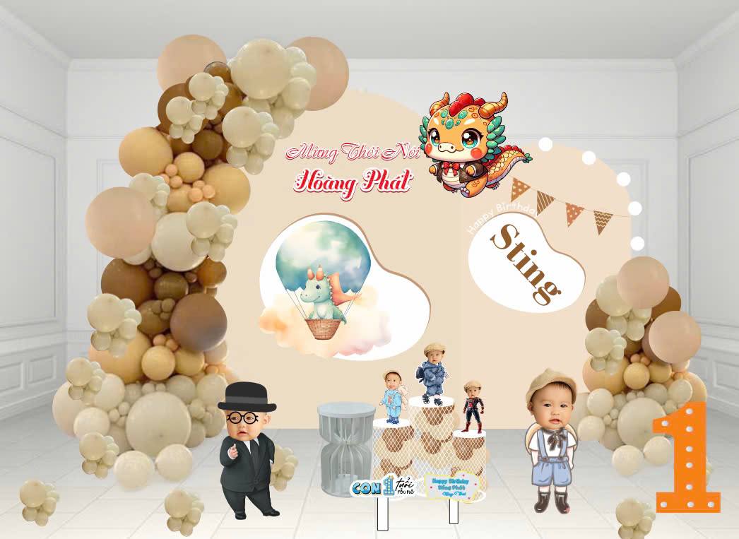 Cá nhân hóa tối đa: Tên bé, hình ảnh và những câu nói ngây ngô được thiết kế lồng ghép khéo léo vào backdrop và bàn gallery.